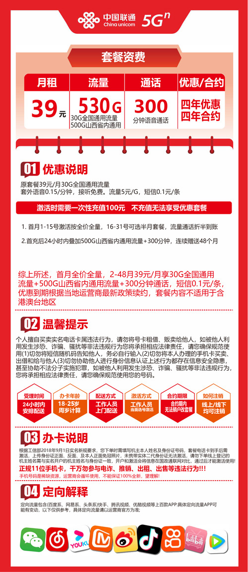 【山西省太原市】联通流量王39元 530G+300分钟 首充100元 四年优惠