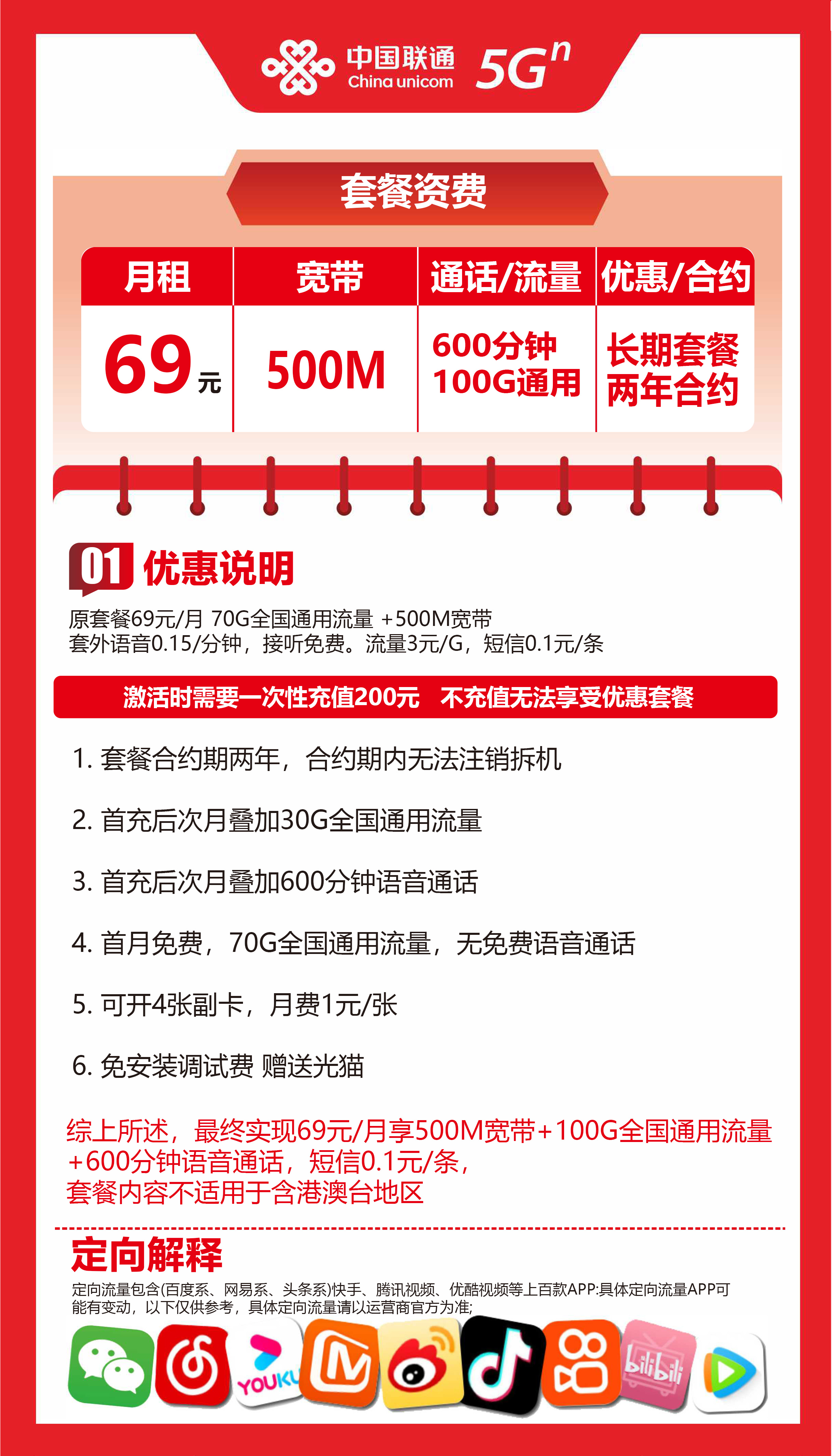 【重庆】联通融合宽带套餐 69元 500M 100G+600分钟 首充200元 长期套餐