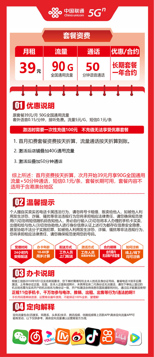 【江苏常州】联通 39元90G+50分钟 首充100 长期套餐